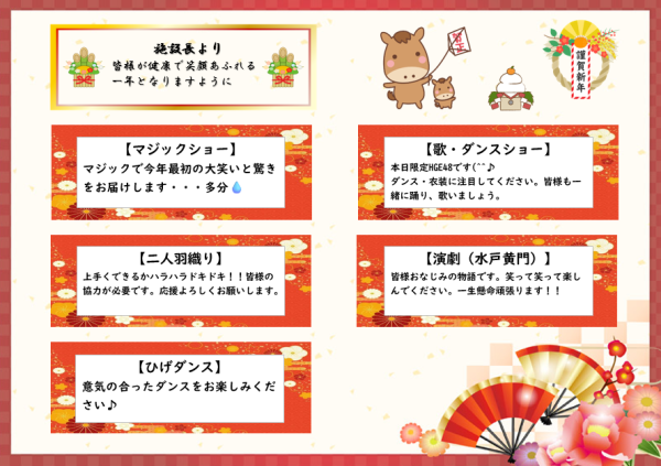下記日程にて、本郷園施設内の新年会を行います。